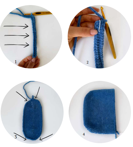1 rnd: from the 2nd ch from the hook 23 sc, 3 sc into the last ch (now, crochet the yarn end from the beginning into the work), along the other side of the chain (photo 1), 22 sc, inc (50)