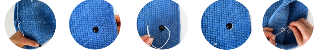 Pay attention so the eyes are placed at the same level, (photo 7). Using YarnArt Jeans yarn in color white, embroider the white part of the eye (photo 8-10). Make a knot with yarn ends on the wrong side of the detail