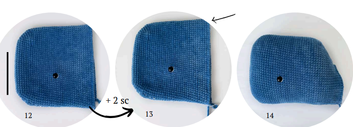 If necessary, make shift stitches or undo some stitches), 7 sc, 4 inc, 9 sc (27)