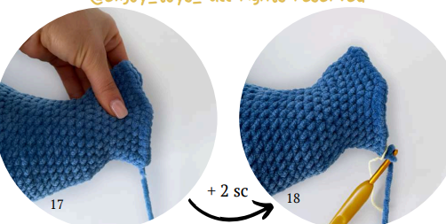 73 rnd: 2 inc, 7 sc, turn the detail, count 10 stitches from the other side of the marker and crochet them as follows: 8 sc, 2 inc (23)