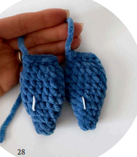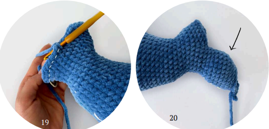 79 rnd: 5 sc, 5 dec, 9 sc (19). The decreases must be located in the inner part of the tail (photo 20).
