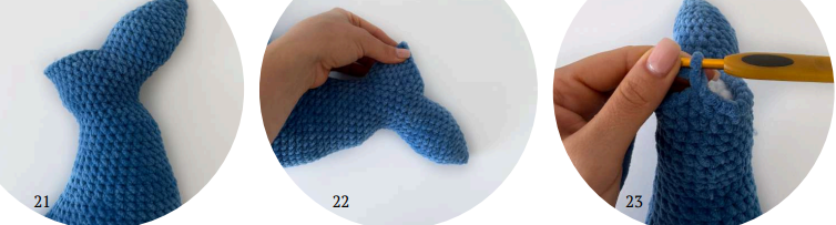 Fold the tail in half and crochet the required number of sc so that the beginning of the round is strictly at the bottom of the tail. I made 2 sc (photos 17-18)