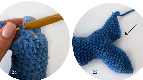 73 rnd: fold the tail, find the center (photo 22), and attach the yarn, ch 1, 1 sc into the same st where ch 1 is coming out, inc, 8 sc, turn, along the other side: 7 sc, 2 inc (23). Place the marker. This will be a new beginning of the round.