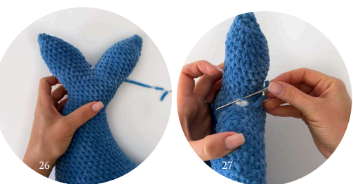 79 rnd: 7 sc, 5 dec, 7 sc (19). The decreases must be located in the inner part of the tail (photo 25).
