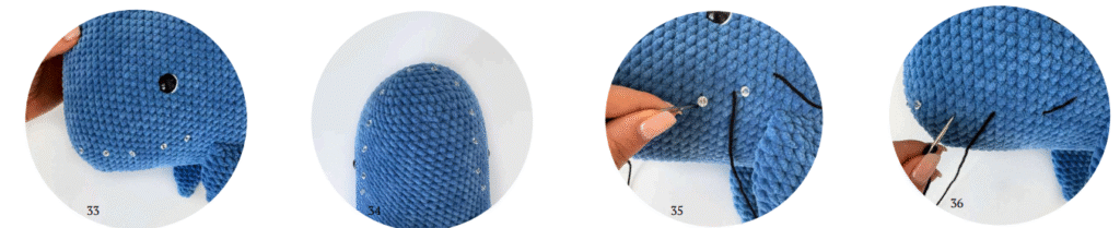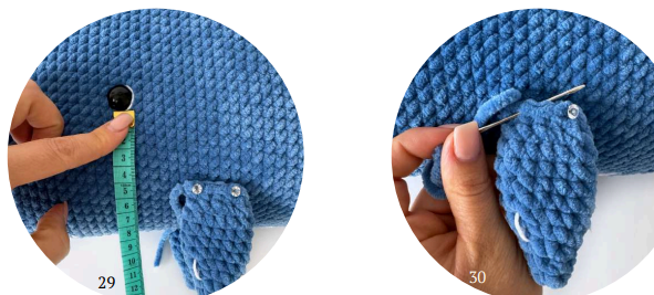 Pin the eyes’ location between 19 and 20 rounds at a distance of 9.5 cm from the bottom part of the whale or 14-15 stitches (photo 5)